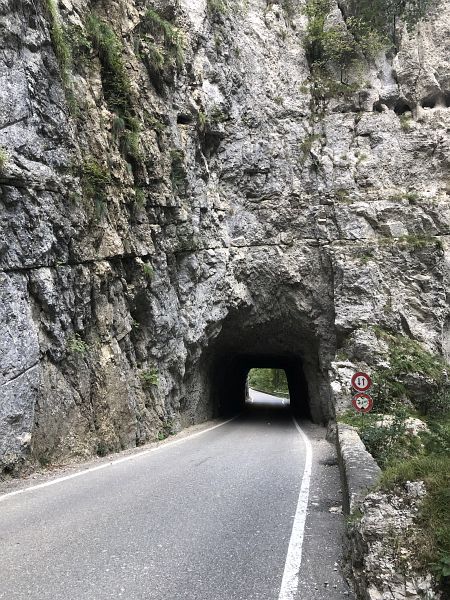 An der Strasse durch die Schlucht ist Steinschlaggefahr, man sieht es auch gut an den vielen herumliegenden Steinbrocken. Als Radfahrer hätte man wenigstens noch einen Helm auf dem Kopf.