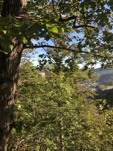 Der höchste Punkt der Wanderung ist aber noch nicht erreicht, dieser folgt um einiges später, nachdem man lange durch Wald und Wiesen gelaufen ist. Ein herrlicher Blick über das Delémont-Tal ist einem bei guter Sicht gewiss. Auf schmalem Pfad geht es steil hinunter ins Dorf Mervelier. Ich war froh, dass ich den Weg bei trockenem Wetter gegangen bin, denn der Weg könnte mit nassem Laub und den Kalksteinen recht rutschig werden.