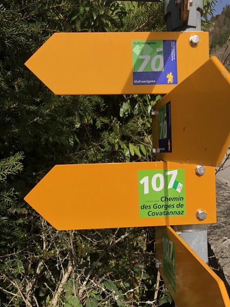 Ab Vuiteboeuf ist der Weg mit «voie historique» und mit «Via Francigena» gekennzeichnet und mit gelben Rauten markiert, obwohl der Wegverlauf in der schweizmobil map nicht immer als Wanderweg eingezeichnet ist. Daher füge ich die Karte noch ein.