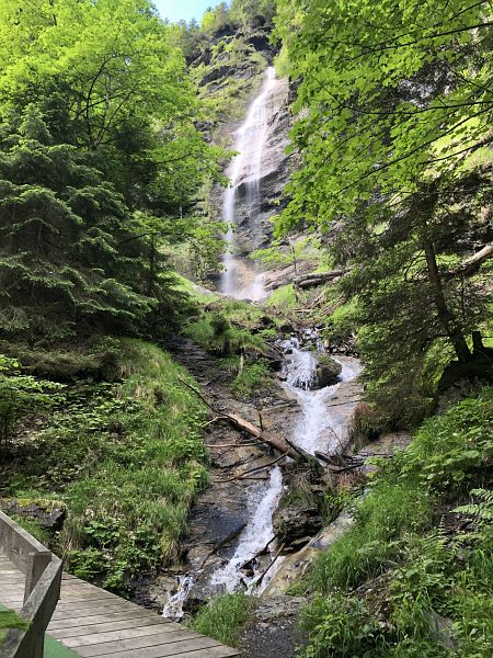 Gleich beim Bahnhof Lauterbrunnen beginnt der Aufstieg. Ein kleines Stück läuft man auf Teerstrasse an schönen Häuser vorbei und dann steil in den Wald hinein. Immer wieder werden Bäche überquert, auch der Straubbach, welcher kurz darauf zum höchsten Wasserfall wird.