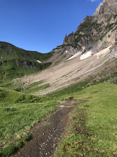 Das erste Wegstück führt, kurz nach einer Feuerstelle, an Felsen vorbei. Zur Sicherheit sind Drahtseile angebracht. Danach läuft man über Alpweiden und auf mässig steinigen Bergwanderwegen, mal mehr und mal weniger steil in die Höhe.