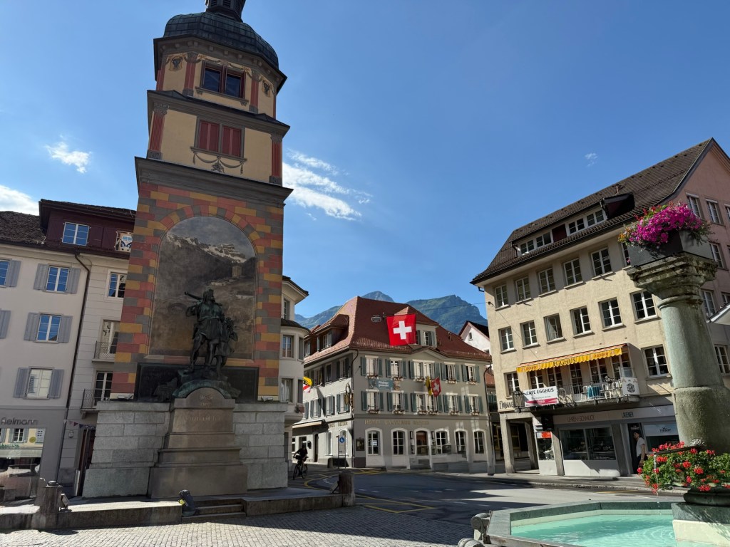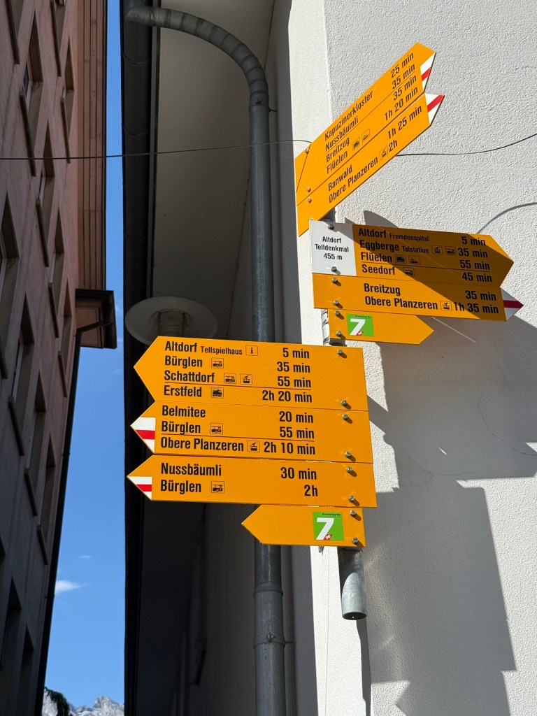 Mit vollgepacktem Rucksack, der mit Wanderstöcken, Proviant und zwei Wasserflaschen etwa 14kg wiegt, bin ich kurz vor zehn Uhr in Altdorf angekommen. Nach der Besichtigung des Türmchens und einem Kaffee war ich startklar für das Wanderabenteuer Via Gottardo.