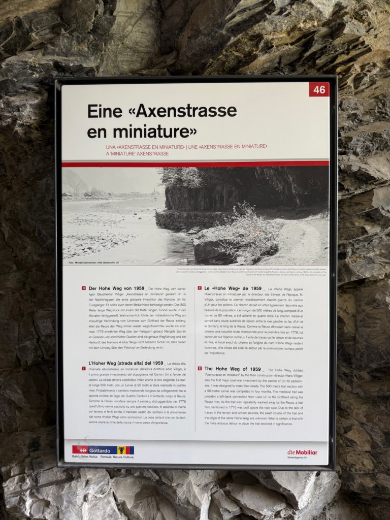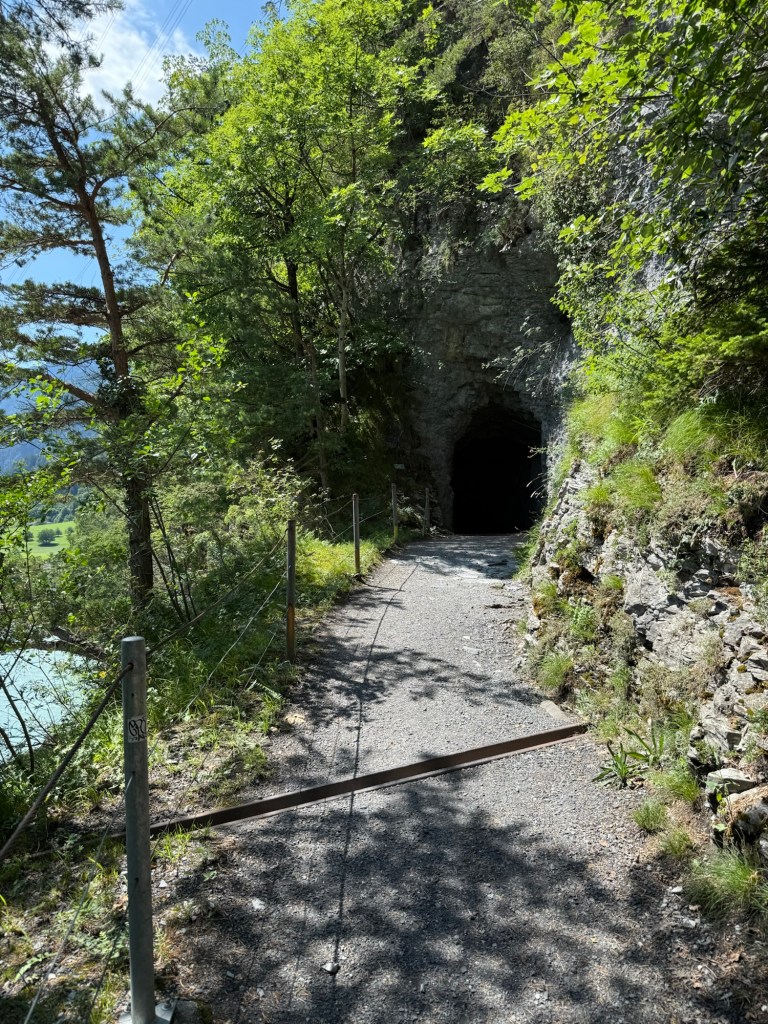 Nach einer Dreiviertelstunde war das Reussufer erreicht, dieser folgt man dann für lange Zeit. (In Hospental fliessen die Furkareuss und die Gotthardreuss zusammen) Im Wissen, dass noch spannende Wegabschnitte folgen werden, nimmt man den eher eintönigen Uferweg in Kauf. Eine Ausnahme gibt es aber doch, die Miniatur-Axenstrasse, ein 90 Meter langer Tunnel.