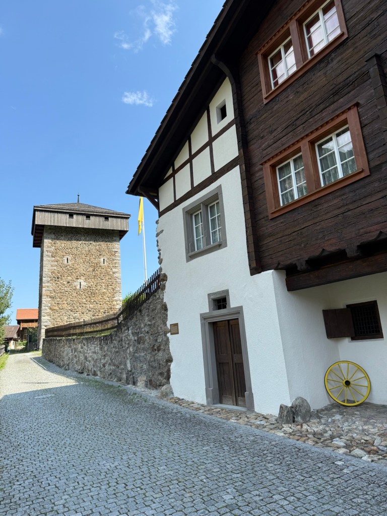 Der gut erhalte Turm aus dem 13. Jahrh. darf besichtigt werden. Er ist, wie das Türmchen in Altdorf, im Innern hohl, diente jedoch einmal als Wohnturm. Moderne Treppenkonstruktionen führen heute die Besucher nach oben.