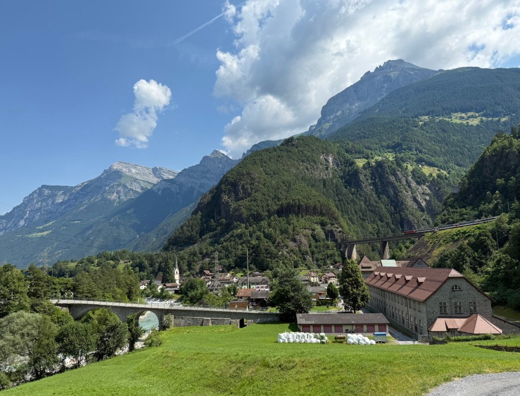 Danach geht es weiter nach Amsteg, wo ein markanter und kunstvoller Bau ins Auge sticht, das SBB Kraftwerk, das den Bahnstrom für die Nord-Südachse und den Gotthardtunnel liefert.