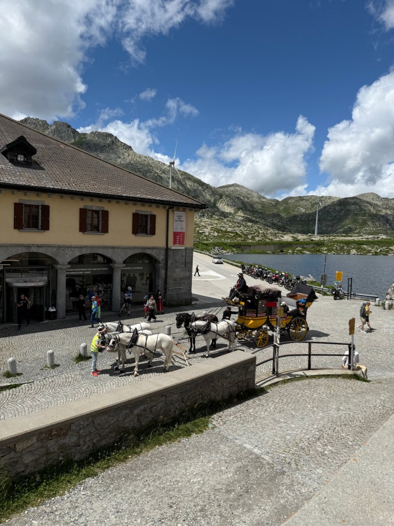 Zwischendurch regnete es immer wieder einmal, aber nur leicht. Oben war’s dann zwischenzeitlich wieder sonnig, so dass ich keine Eile hatte und erst das Nachmittagspostauto für die Rückfahrt plante. So blieb mir Zeit für ein Mittagessen auf der windigen Terrasse des Albergo San Gottardo. Nachher war ich dann aber doch froh, den Ort mit dem wechselhaften und kühlen Wetter Richtung Süden verlassen zu dürfen.