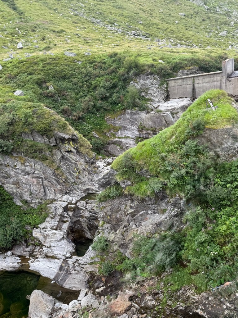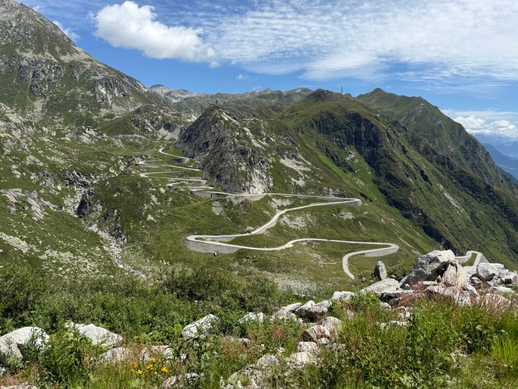 Es sind Reparaturarbeiten im Gange, es ist lärmig und der Wanderweg von Bauutensilien belegt. Dafür hat man von dort einen schönen Blick auf die Serpentinen der alten Passstrasse.