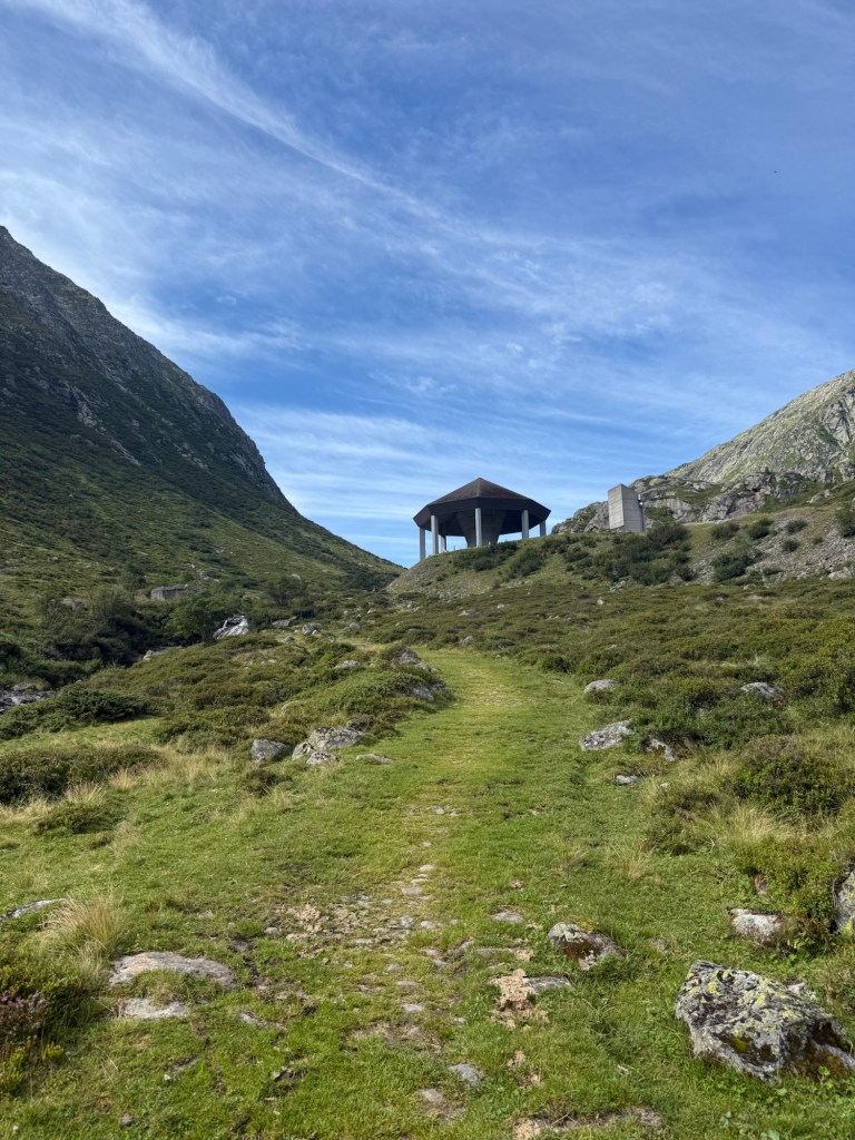Es war früher Nachmittag, den Mittagsbus habe ich ganz knapp verpasst, was auch nicht bedauernswert war, wieso schon heimfahren. Doch zwei Stunden auf dem Pass verbringen, wollte ich auch nicht, ich war ja vor zwei Wochen schon da. Ohne Halt lief ich am Ospizio vorbei, vor der kleinen Kapelle nach rechts und zu den „Galleria artificiale Ganne di San Antonio„, also der Hauptstrasse über den Gotthardpass.