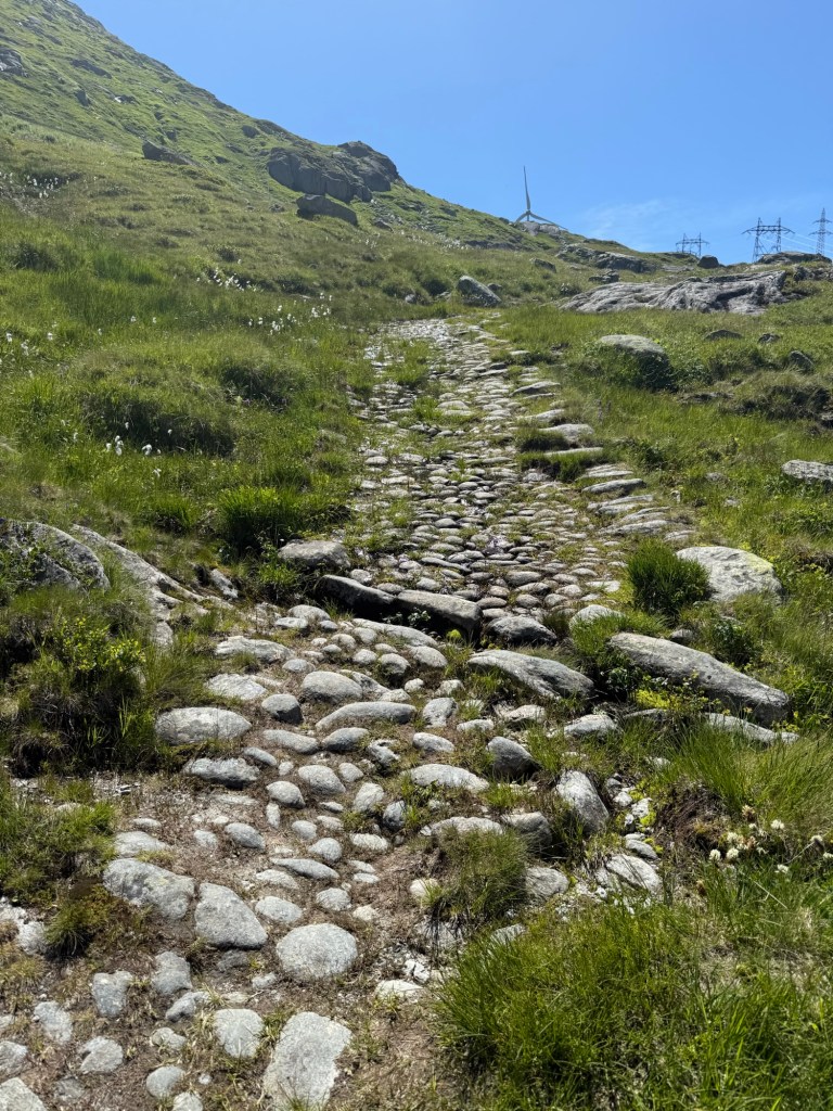Der Weg wird später doch noch etwas steiler, teilweise ist weiter oben noch die Pflästerung des alten Saumweges ersichtlich. Leider sind die Alpenrosen alle schon verblüht, dazu ist der Sommer bereits zu weit fortgeschritten. Dann kommen die Windräder in Sicht, und bald schon betritt man den Kanton Tessin, bis zur Passhöhe ist es dann auch nicht mehr allzu weit.