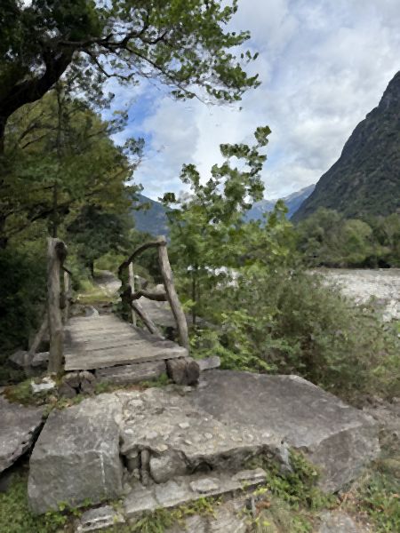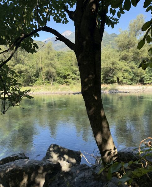 Kaum erreichte ich wieder den Uferweg, fand ich es bereits schon recht warm, es war erst neun Uhr am Morgen. Wenig weiter muss man unter der Autobahn hindurch und ich verlor ein wenig die Orientierung, respektive, ich achtete nicht so genau auf die Wegweiser. Es geht zuerst nach links um den Zufluss der Moesa zu überqueren, danach kommt man wieder ans Ufer der Ticino. Da ist es dann möglich, statt dem markierten Wanderweg entlang dem Trampelpfad nah am Wasser zu laufen, da war es noch etwas schattig.